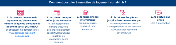 Une fois que vous avez créé votre compte al in, vous pouvez accéder à toutes les offres sur la plateforme et créer une demande de logement social. Pour ce faire, vous n’avez qu’à suivre les procédures expliquées par le site :